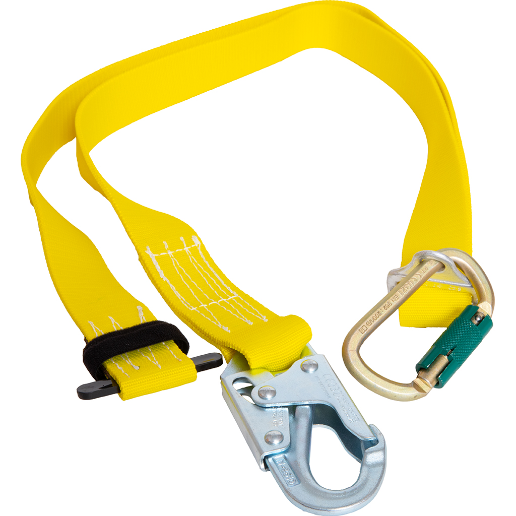 Adjustable web lanyard that can be used as a second positioning strap to secure a user when climbing over obstacles – 8′ long.