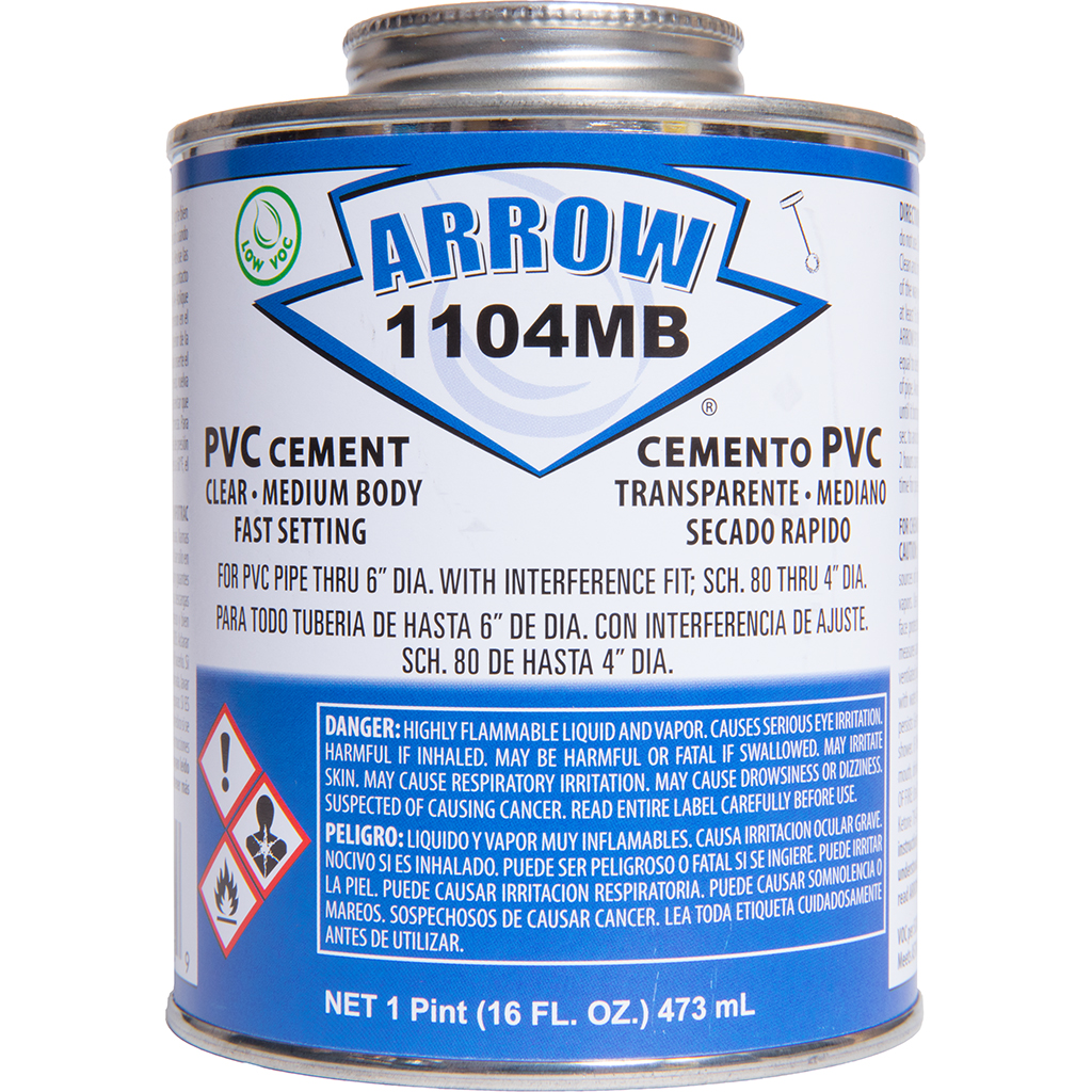 Arrow AA-1104MB Medium-bodied clear cement for use on PVC plastic pipes and fittings. Up to 6″ diameter for sch. 40 and sch. 80. Recommended for all grades and types of PVC pipe and fittings, potable water drain, pressure pipe, gas, conduit, and DWV. Apply at temperatures 40°F – 100°F.
