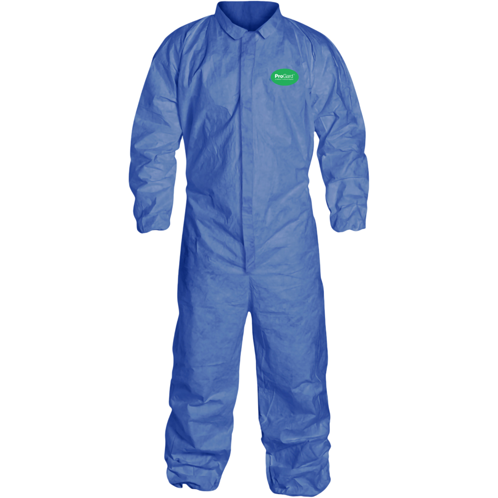 Blue disposable coveralls with elastic wrists and ankles. No hood. Breathable 3-layer fabric with “best” comfort rating. Provides extra protection against low surface tension liquids and is treated with an anti-static coating. Provides dry particulate protection for pharmaceuticals and electronics. Provides liquid protection for spray painting and fiberglass handling.