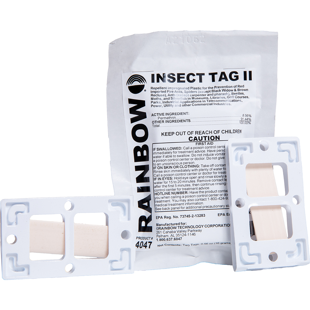 Apply INSECT TAG II inside aerial closures and terminals, pole-mounted equipment, customer premise equipment, cable closures, terminal boxes, telecommunications, power and utilities, electronics, street lighting, computers, railroad systems, municipalities, security and smoke alarms, traffic control systems, network interface devices, meter boxes surge protectors, various OEM equipment, and outdoor equipment or contained areas. One application repels and kills insects around the clock.