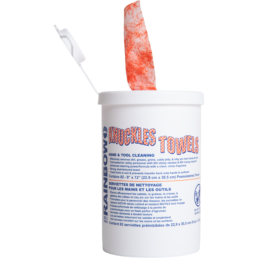 Knuckles Hand & Tool Cleaning Towels are specially formulated to dissolve and absorb dirty contaminants from hands, tools, and equipment. The towels are textured on one side, allowing the user to scrub embedded, tough-to-clean contaminants, such as cable filling compounds, icky PIC, c-cement, tar, asphalt, heavy greases, etc. The other side is smooth, which works to trap and absorb the cleaner and dirty contaminants back into the towel, leaving hands, tools, and equipment surfaces clean. These ready-to-use, pre-moistened, shop-sized towels are available in a light and portable dispensing bucket of 82 (79315) or as individual packages (79316). Knuckles Hand & Tool Cleaning Towels will not harm rubber goods, including rubber lineman’s gloves.