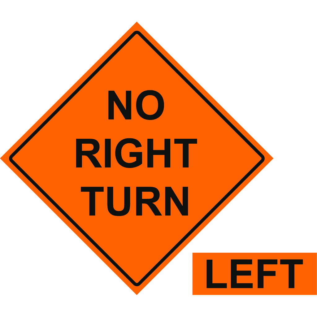 48″ x 48″ roll-up traffic sign. Reads: “No Right Turn”. Comes with a “Left” overlay.