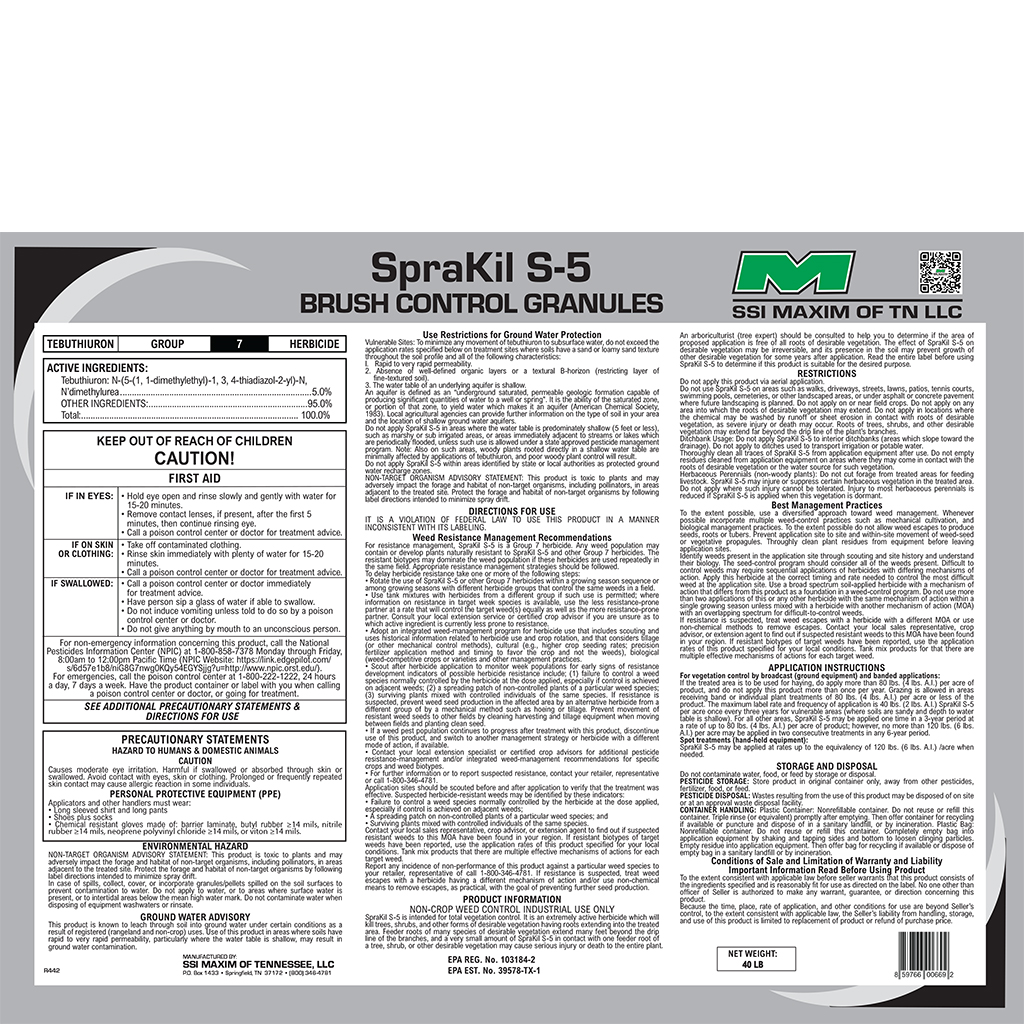 Sprakil S-5 Brush Control Granules contains 5.0% Tebuthiuron formulation on a dry granulated limestone carrier. It kills vegetation by absorption through the plant root system.