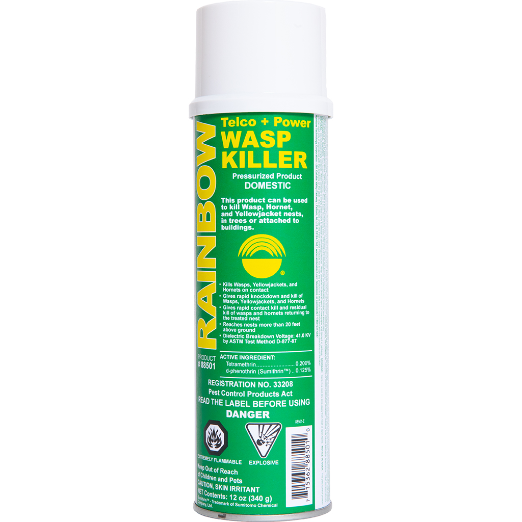 Rainbow Technology has confidence in the quality and effectiveness of our products. We test our products to confirm that they will do what we say they will do. Telco + Power Wasp Killer meets the most difficult wasp spray specifications ever developed. You may request a copy of the (Bellcore) Telcordia Technical Reference (TR-620-23352-84-03), Issue 1, August 1984 “Wasp and Hornet Spray.” Telco + Power Wasp Killer is a PMRA registered product.