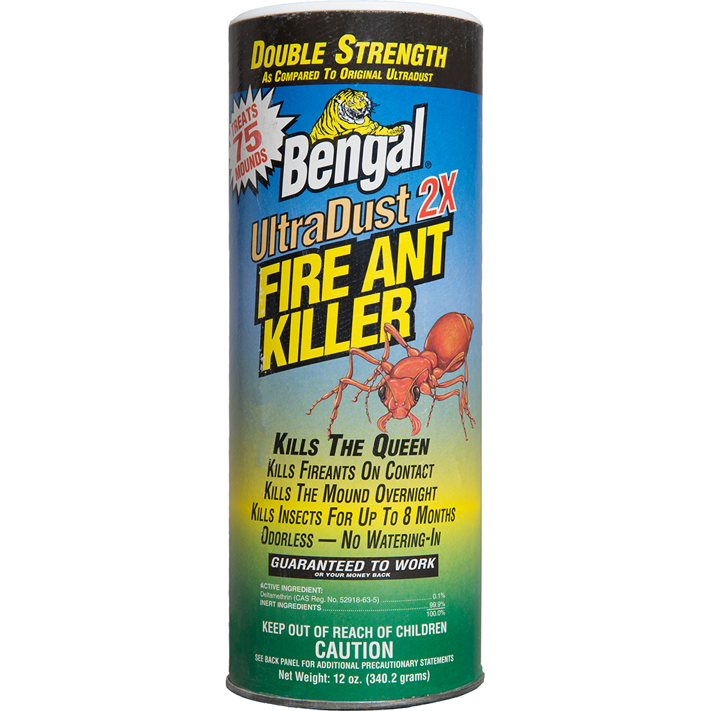 Bengal UltraDust 2X Fire Ant Killer treats 75 mounds. Odorless. No water required to activate. Kills the queen. Kills fire ants on contact. Kills the fire ant mound overnight. Kills the insects for up to 8 months. Faster acting than bait products. Does not clump or absorb moisture. Also use on roses and ornamental plants. Easy-to-use shaker canister.