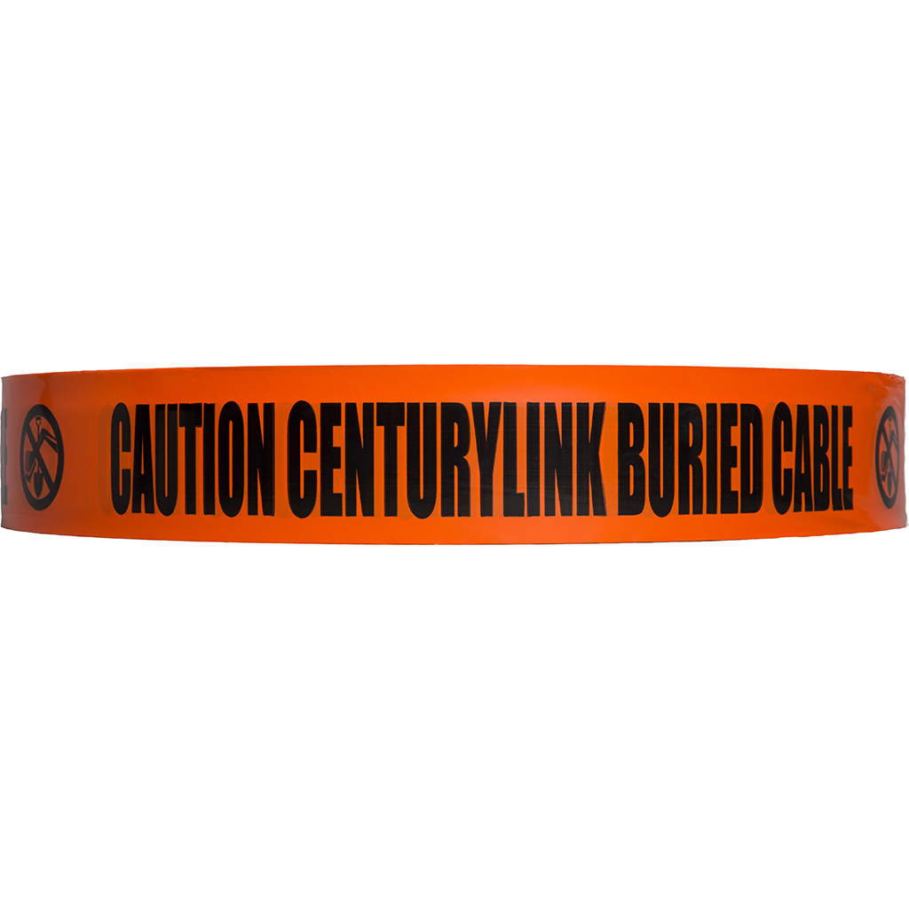 3″ wide orange roll with black letters on 4 ml tape. Tape reads: Caution CenturyLink Buried Cable.