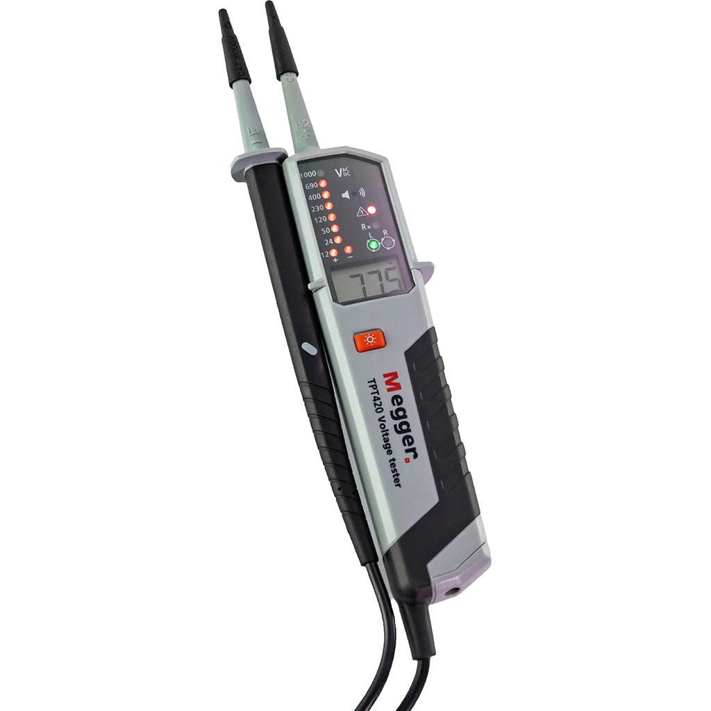 The Megger TPT420 voltage tester is designed to provide electricians and electrical engineers with an easy to use voltage indicating instrument. The meter will continue to warn the operator of dangerous test voltages even when the batteries are exhausted.